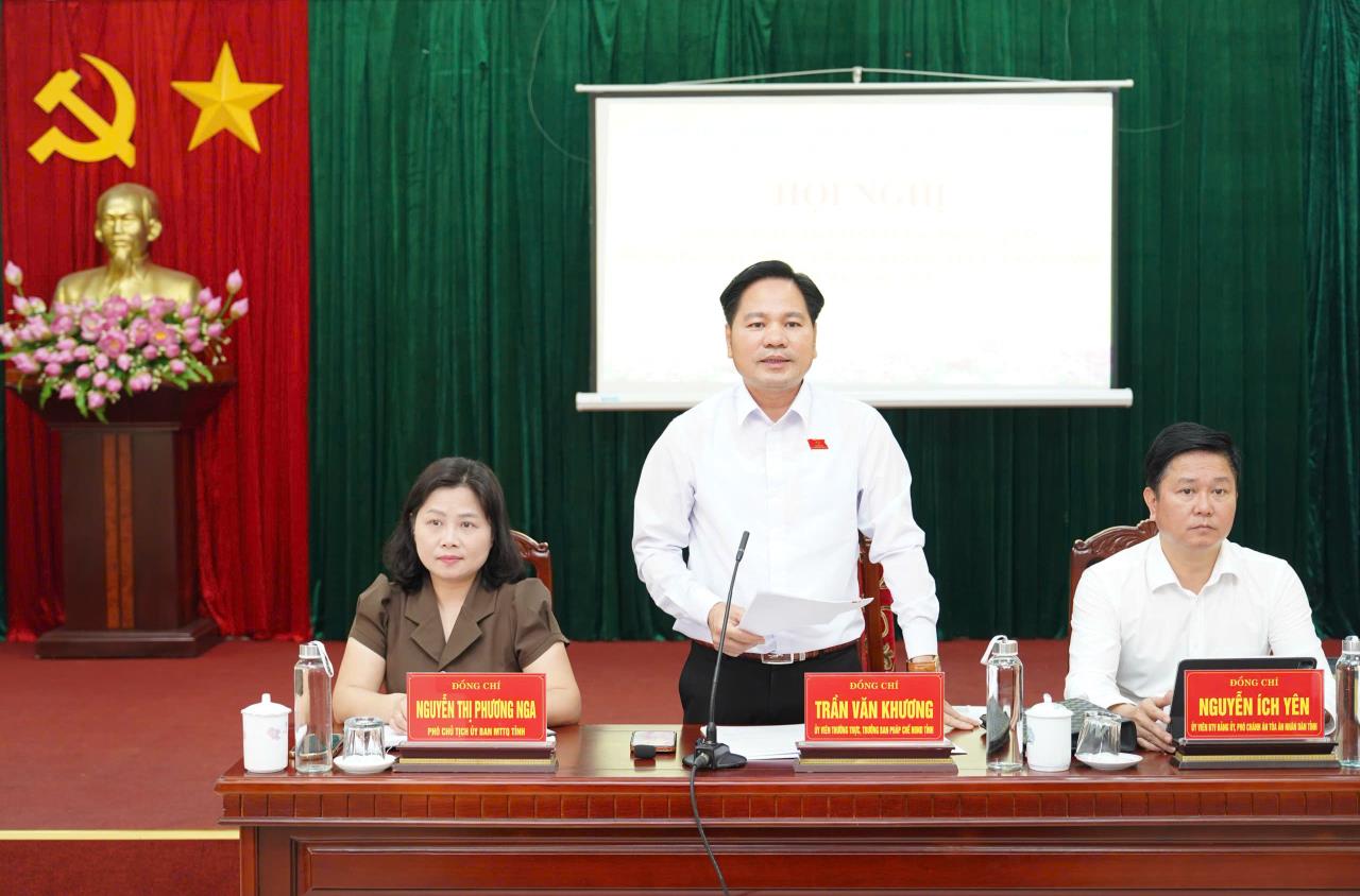 Đồng chủ trì hội nghị có các đồng chí: Trần Văn Khương, Ủy viên Thường trực HĐND, Trưởng Ban Pháp chế HĐND tỉnh; Nguyễn Thị Phương Nga, Phó Chủ tịch Ủy ban Mặt trận Tổ quốc Việt Nam tỉnh; Nguyễn Ích Yên, Phó Chánh án Tòa án nhân dân tỉnh.